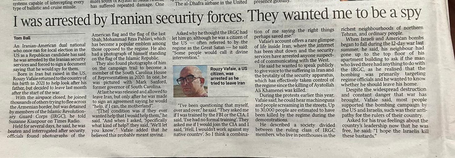 I’ve known Rouzy Vafaie for many years; unusually he’s a US / Iranian dual national who’s felt confident enough to live inside Iran, even as the war began. We’ve been in touch throughout, even though communicating with people outside Iran, let alone with journalists, carries huge risk. He told me he was planning to leave via the border with Armenia, but then all contact ceased. For many days I was extremely worried; finally he was able to contact me to tell me he had escaped, but not after days of detention and beatings from Iranian security services.