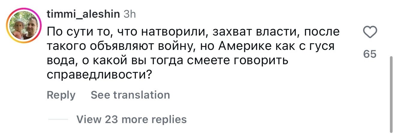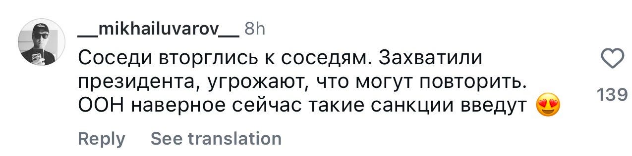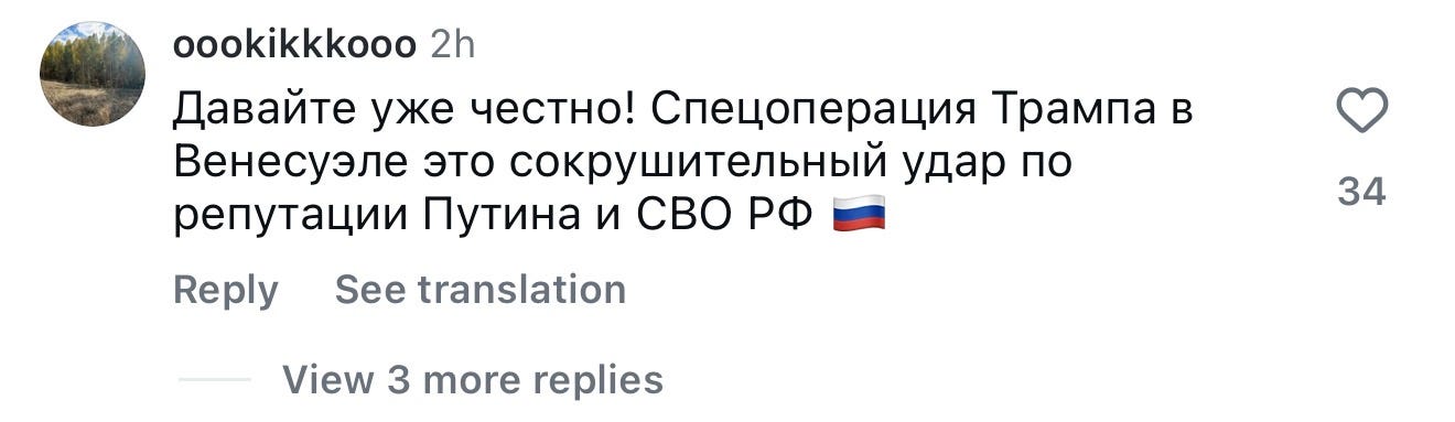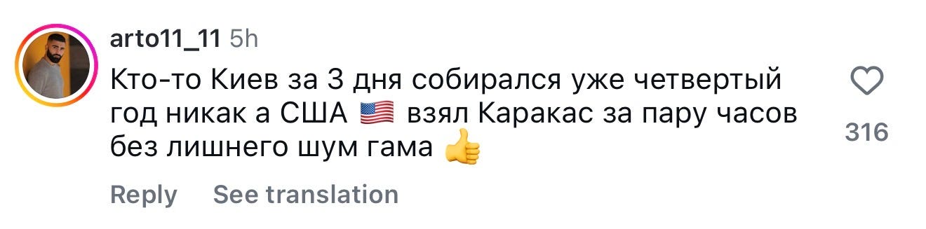 “Or is it different?” is a segment of comments pointing out the double standards. Many people are frustrated at world’s response to the U.S.' invasion of Venezuela. The motives stated by the U.S. official, to prevent adversary influence on a neighboring country and ensure the U.S. national interests, sound particularly familiar to the Russian public. However, we don’t see immediate harsh sanctions for the U.S., compared to the world’s response to invasion of Ukraine.