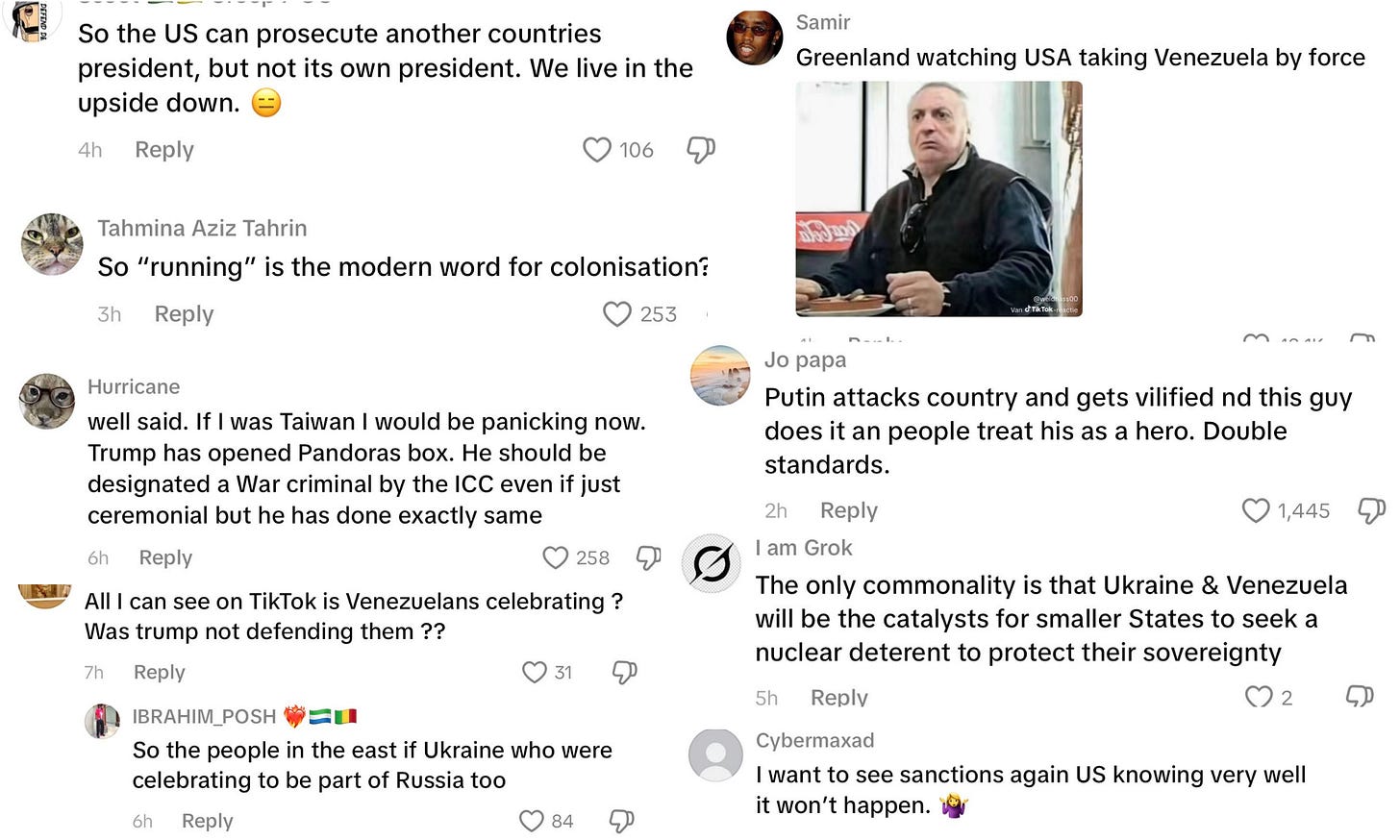 People went on social media to share their thoughts. Some of the most recurring comment themes were colonization, comparison to Putin’s invasion of Ukraine, Greenland/Canada, and fights whether dictatorship can be a justification for invasion of Venezuela.